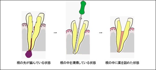 ただ神経を取るだけでは、その歯を有効に機能させていくことはできません。感染した歯の根の内側を完全に取り除き、細菌感染や炎症の再発をおこさないよう、細心の注意を払いながら治療を進めます。これを怠ると根の先端部で炎症を起こし、ひどくなると顎の骨にまで炎症が拡大してしまうことがあります。