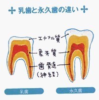 歯はその後に出てくる永久歯より小さく、特に歯のエナメル質、象牙質とも永久歯と比較して遙かに薄く、歯の質も軟らかく、 むし歯になりやすい構造です。