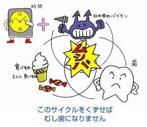むし歯は口の中の「細菌(ミュータンス菌)」「歯の質」「糖質(とくに砂糖)」という3つの要素に加え、時間の経過とともに発病します。