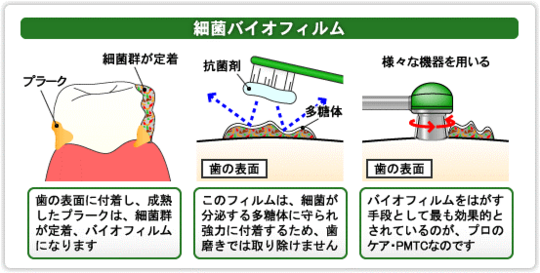 日頃、歯を磨いていてもどうしても歯の表面には、粘着性の細菌バイオフィルムが付着しています。